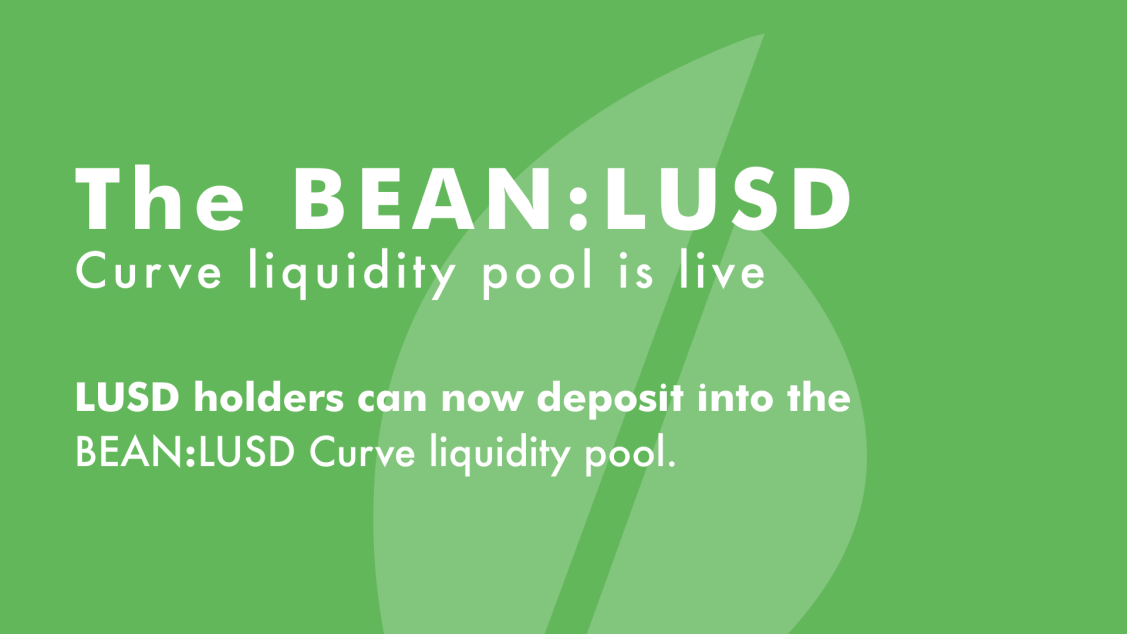 Today, Beanstalk Farms deployed a new BEAN:LUSD Curve stableswap liquidity pool. Beanstalk Farms intends to propose a Beanstalk Improvement Proposal within the next week to whitelist BEAN:LUSD LP tokens for Deposit into the Silo, which will provide a novel and competitive yield opportunity for LUSD holders in advance of the upcoming stability reward halving.