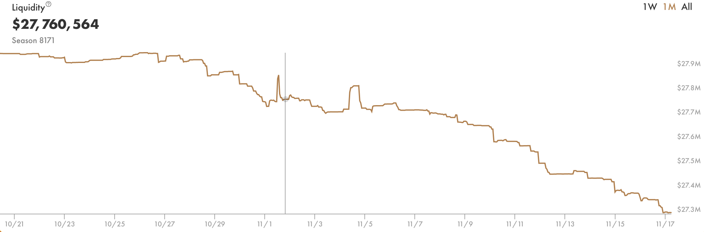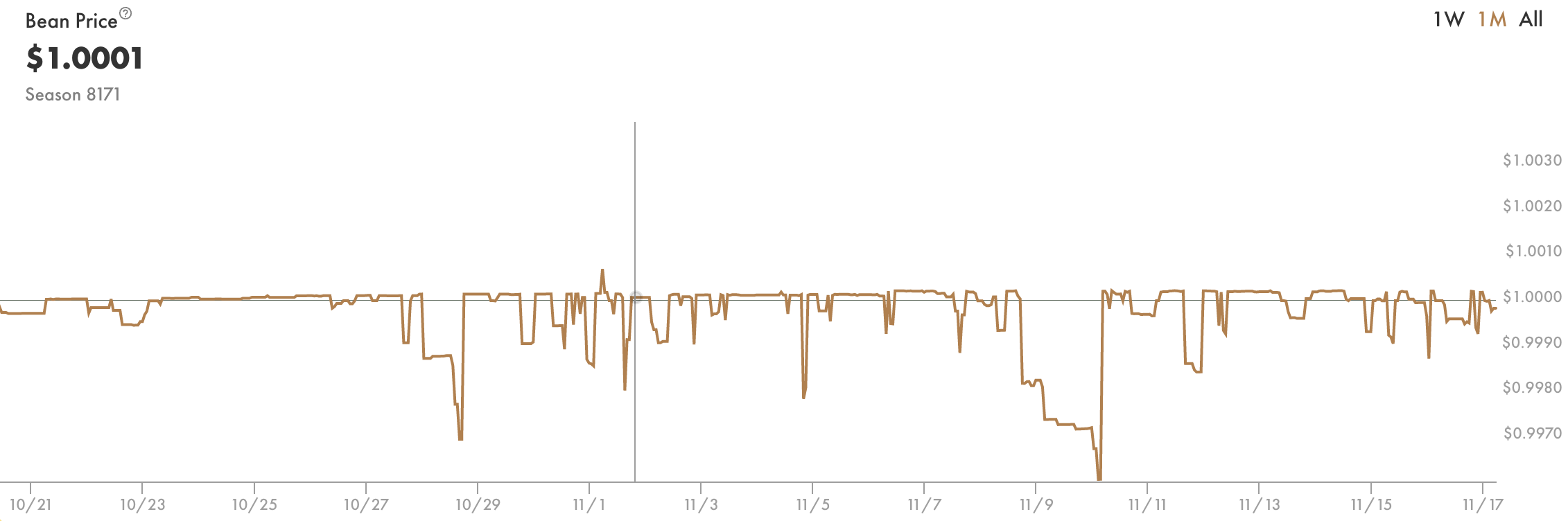 The price of Bean crossed its peg 197 times and protocol liquidity decreased 1.7% to ~$27.3M.
