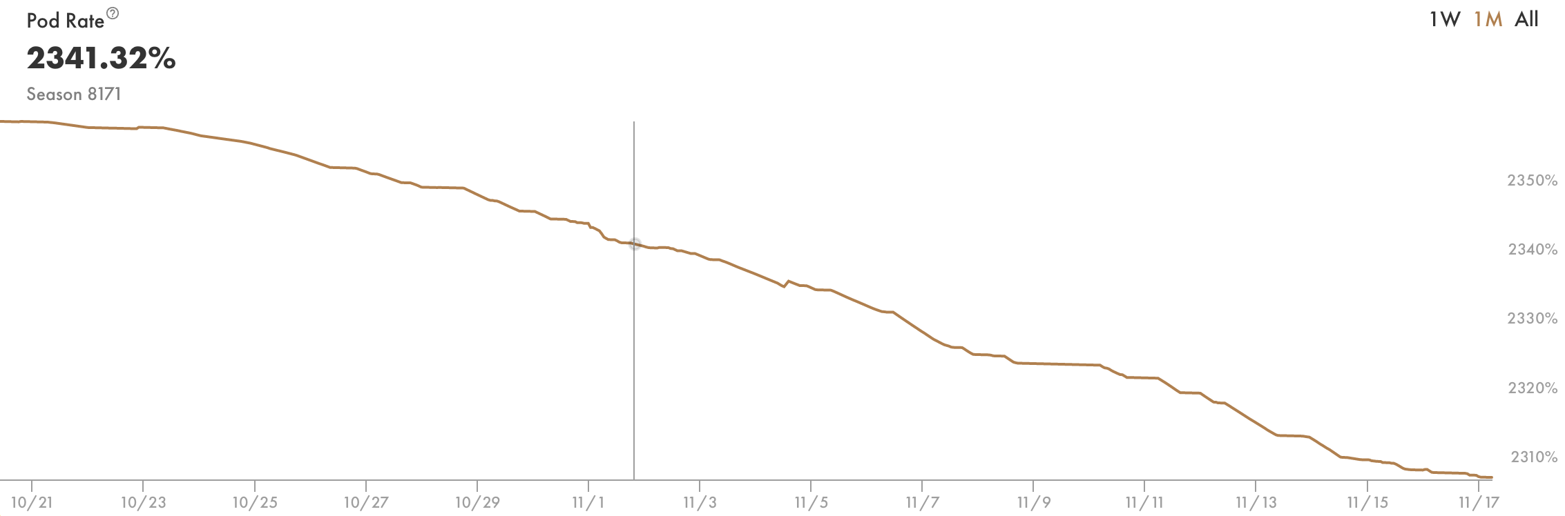 The Pod Rate (outstanding Pods per Bean) decreased 33.8 points to 2307%.